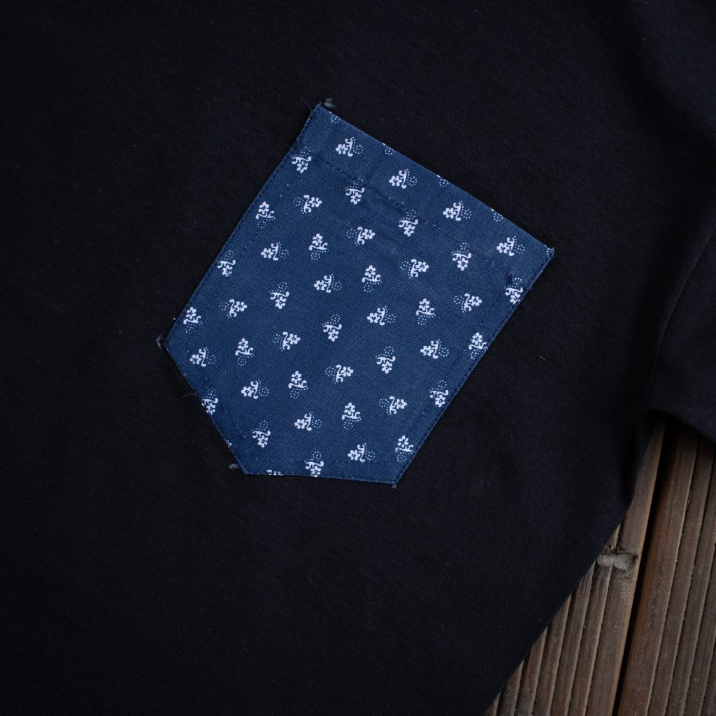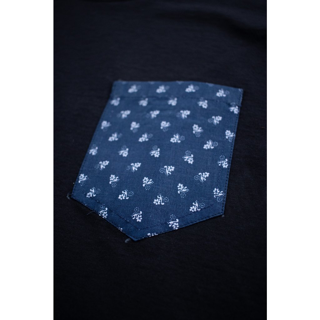 Bílé tričko s našitou kapsou s modrotiskovým motivem.
